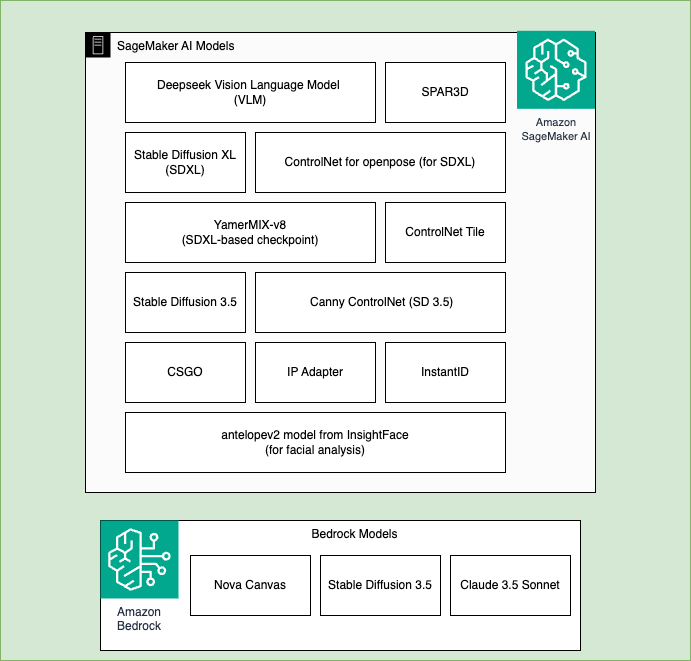 The following image illustrates the models used by both Amazon SageMaker AI and Amazon Bedrock in our solution. Models for Amazon SageMaker AI include: DeepSeek VLM, SDXL, Stable Diffusion 3.5, SPAR3D, ControlNet for openpose, Yamix-8, ControlNet Tile, ControlNet for canny edges, CSGO, IP Adapter, InstantID, antelopev2 model from InsightFace. Models used by Amazon Bedrock include: Nova Canvas, Stable Diffusion 3.5, and Claude 3.5 Sonnet.