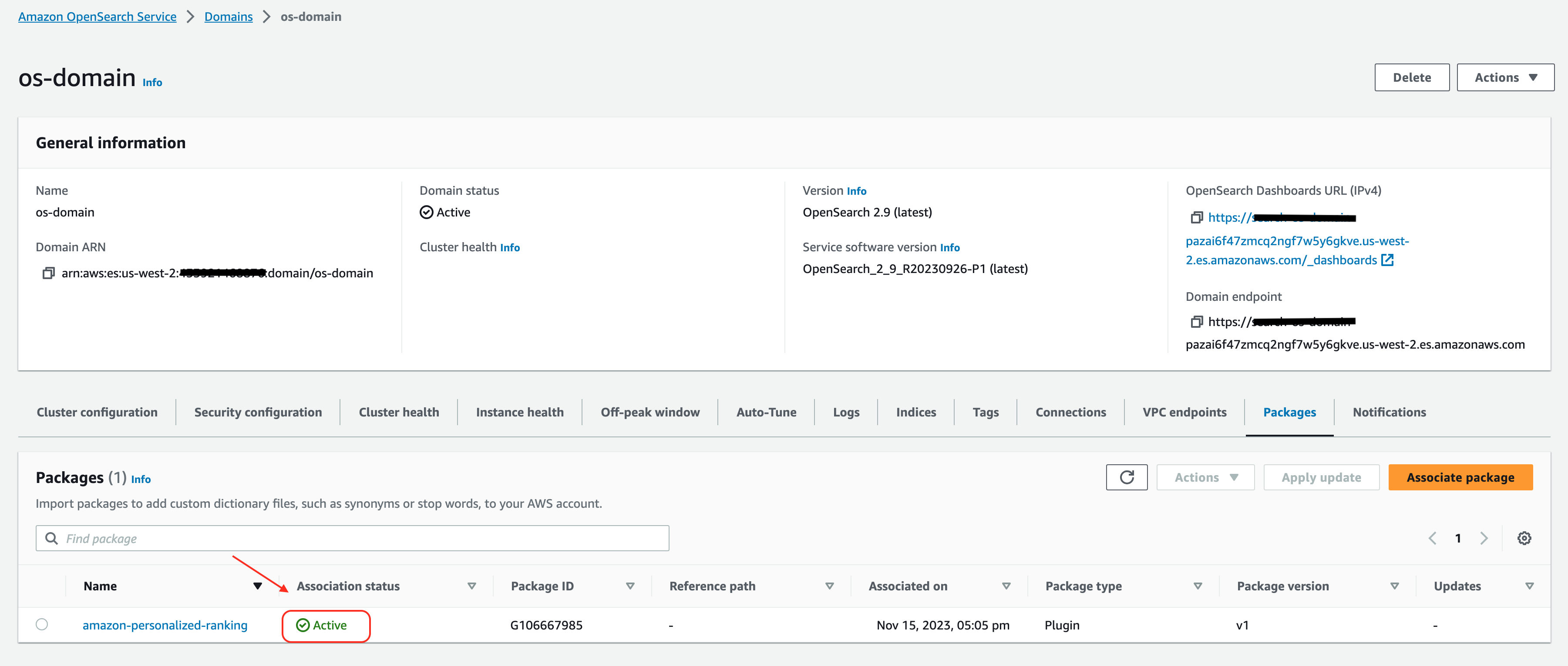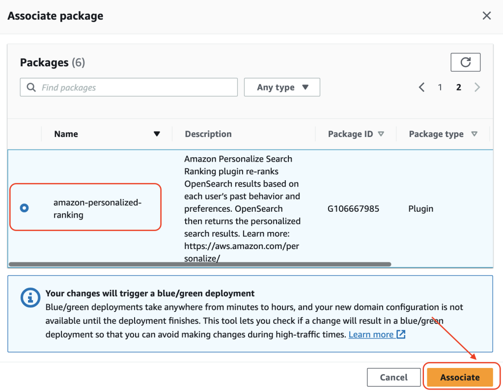 2. On the Packages tab, choose Associate package to associate the Amazon Personalize Search Ranking plugin with your OpenSearch Service domain. The plugin version must match the OpenSearch Service domain version.