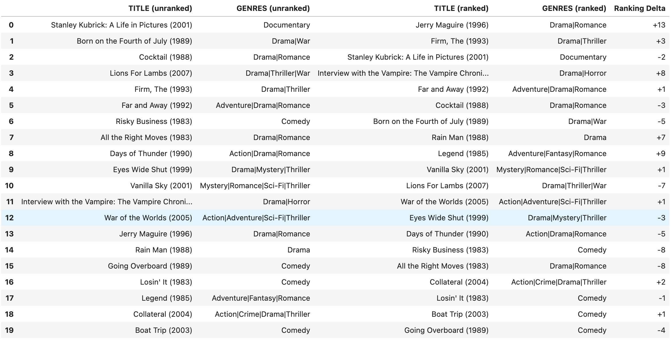 Let’s consider personalizing results for a user with ID 12. First, we check this user’s recent interactions by running the code in the 3.Testing.ipynb notebook to retrieve their interaction history. This allows us to see what types of movies this user has reviewed recently, which can inform how we personalize recommendations for them.