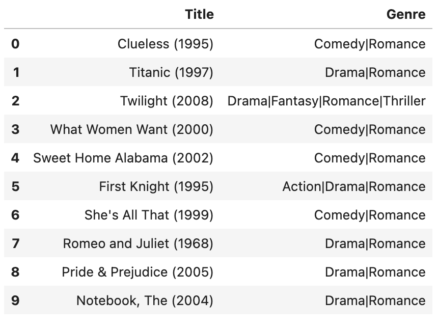 In this example, we see that the user has expressed interest in drama, romance, and thriller movie genres. To provide personalized recommendations, we first run queries with personalization parameters enabled, utilizing the user’s genre preferences. We then run the same queries without personalization enabled, for comparison. The following results show the difference between the non-personalized and personalized recommendation outputs.