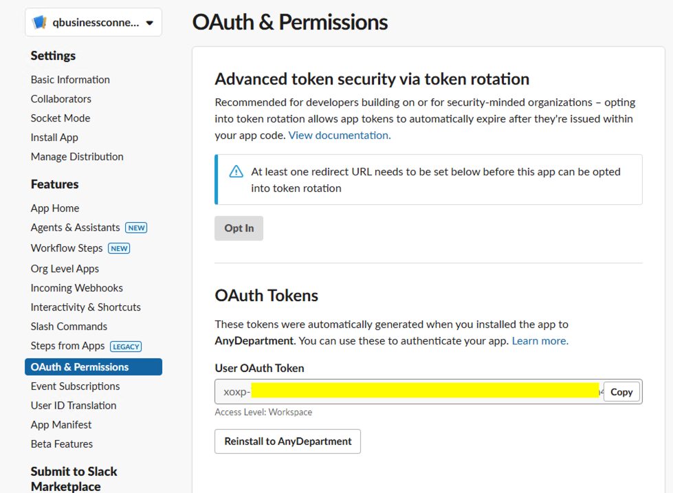 - This will generate a user OAuth token. Copy this token to use when configuring the Amazon Q Business Slack connector.