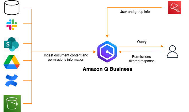Amazon Q Business uses large language models (LLMs) to build a unified solution that connects multiple data sources. Typically, you’d need to use a natural language processing (NLP) technique called Retrieval Augmented Generation (RAG) for this. With RAG, generative AI enhances its responses by incorporating relevant information retrieved from a curated dataset. Amazon Q Business has a built-in managed RAG capability designed to reduce the undifferentiated heavy lifting involved in creating these systems. Typical of a RAG model, Amazon Q Business has two components: A retrieval component that retrieves relevant documents for the user query and a generation component that takes the query and the retrieved documents and then generates an answer to the query using an LLM.