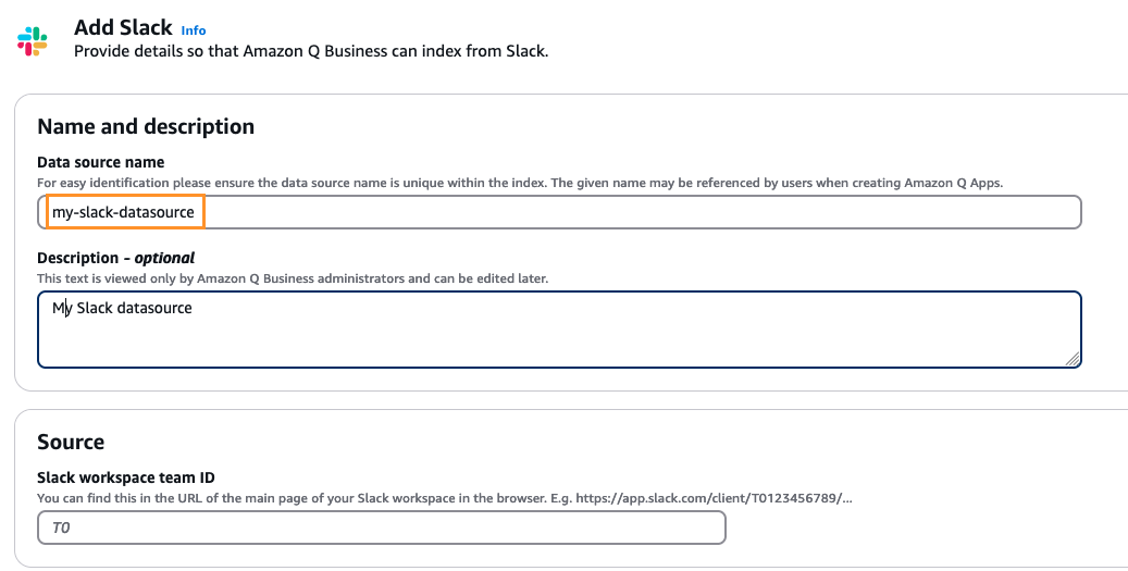 - Enter a Data source name and a Description to identify your data source and then enter the Slack workspace team ID to connect with Amazon Q Business.