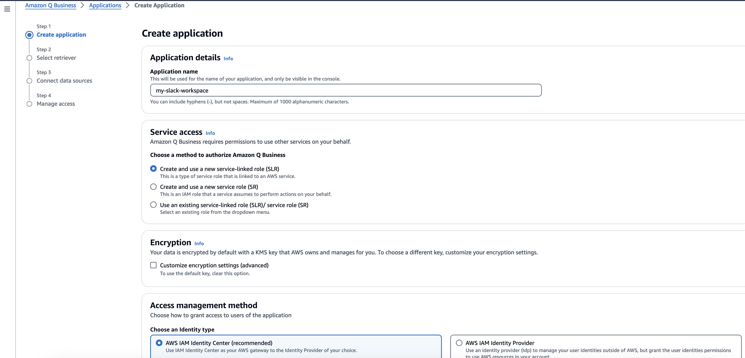 my-slack-workspace. Leave the Service access as the default value, and select AWS IAM Identity Center for Access Management . Enter a new Tag value as required and choose Create to the Amazon Q Business Application.