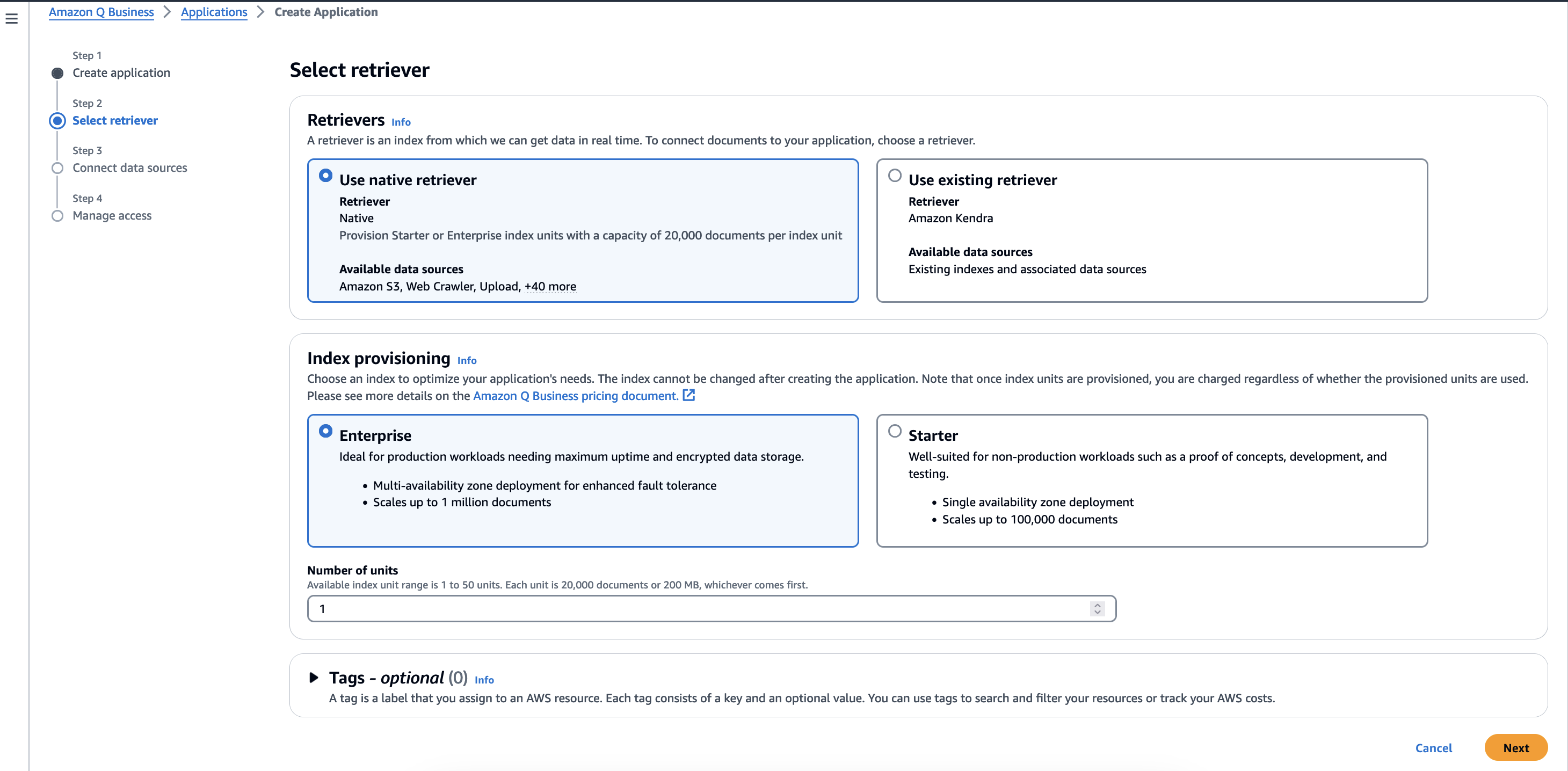 - Leave the default option of Use Native retriever selected for Retrievers, leave Enterprise as the Index provisioning and leave the default value of 1 as the Number of units. Each unit in Amazon Q Business index is 20,000 documents or 200 MB of extracted text (whichever comes first). Choose Next.