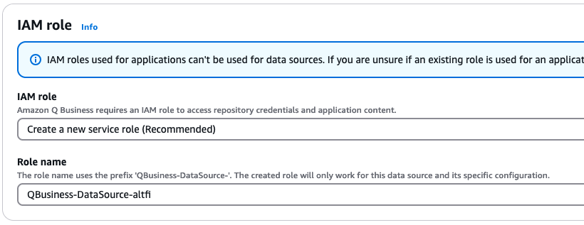 - Create an AWS Identity and Access Management (IAM) role for your data source and, if using the Amazon Q Business API, note the ARN of the IAM role.