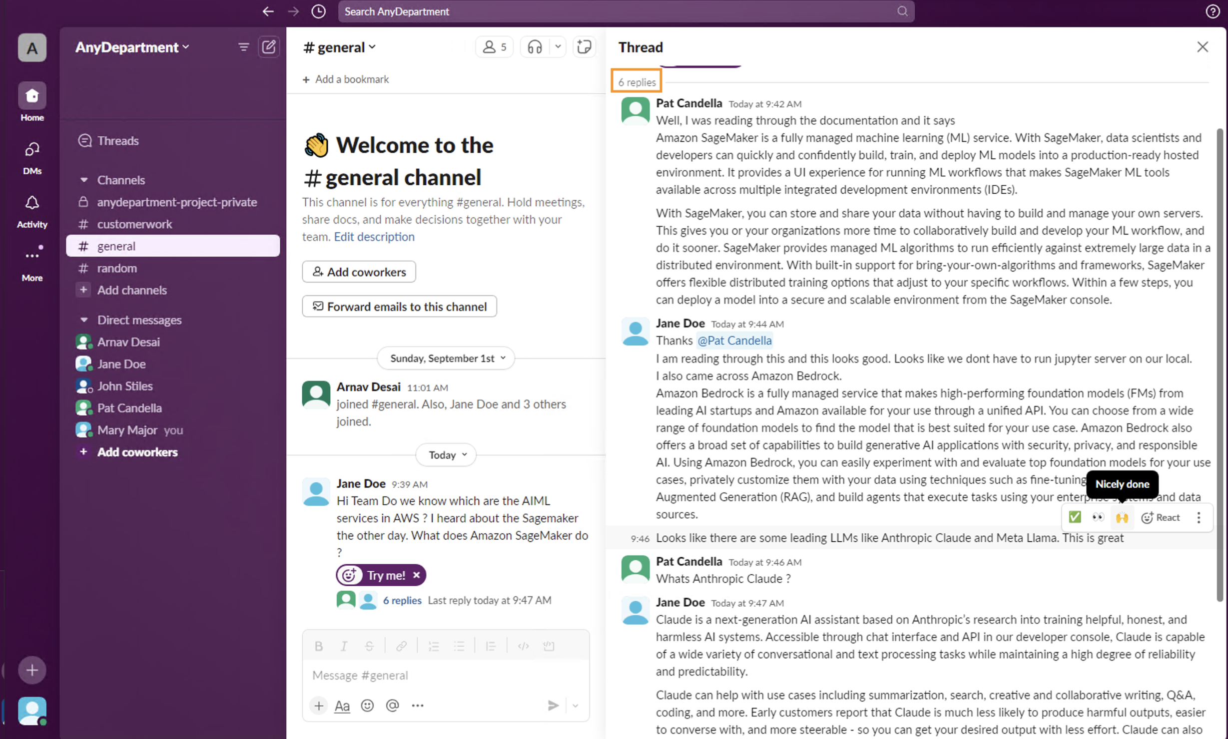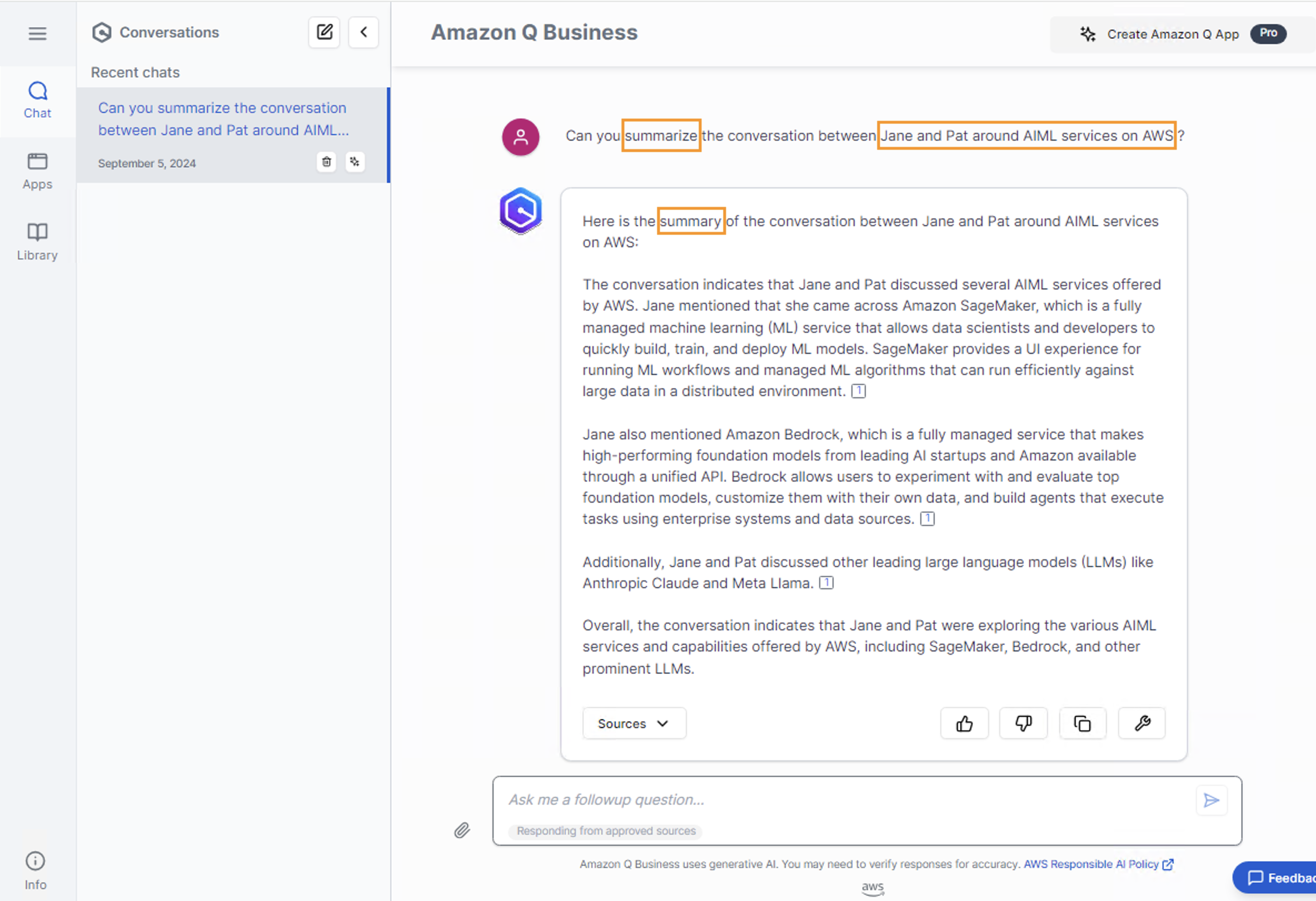 Because the conversation thread is aggregated as a single document within the Amazon Q Business index, you can ask questions that pertain to a single conversation thread as shown in the following figure.