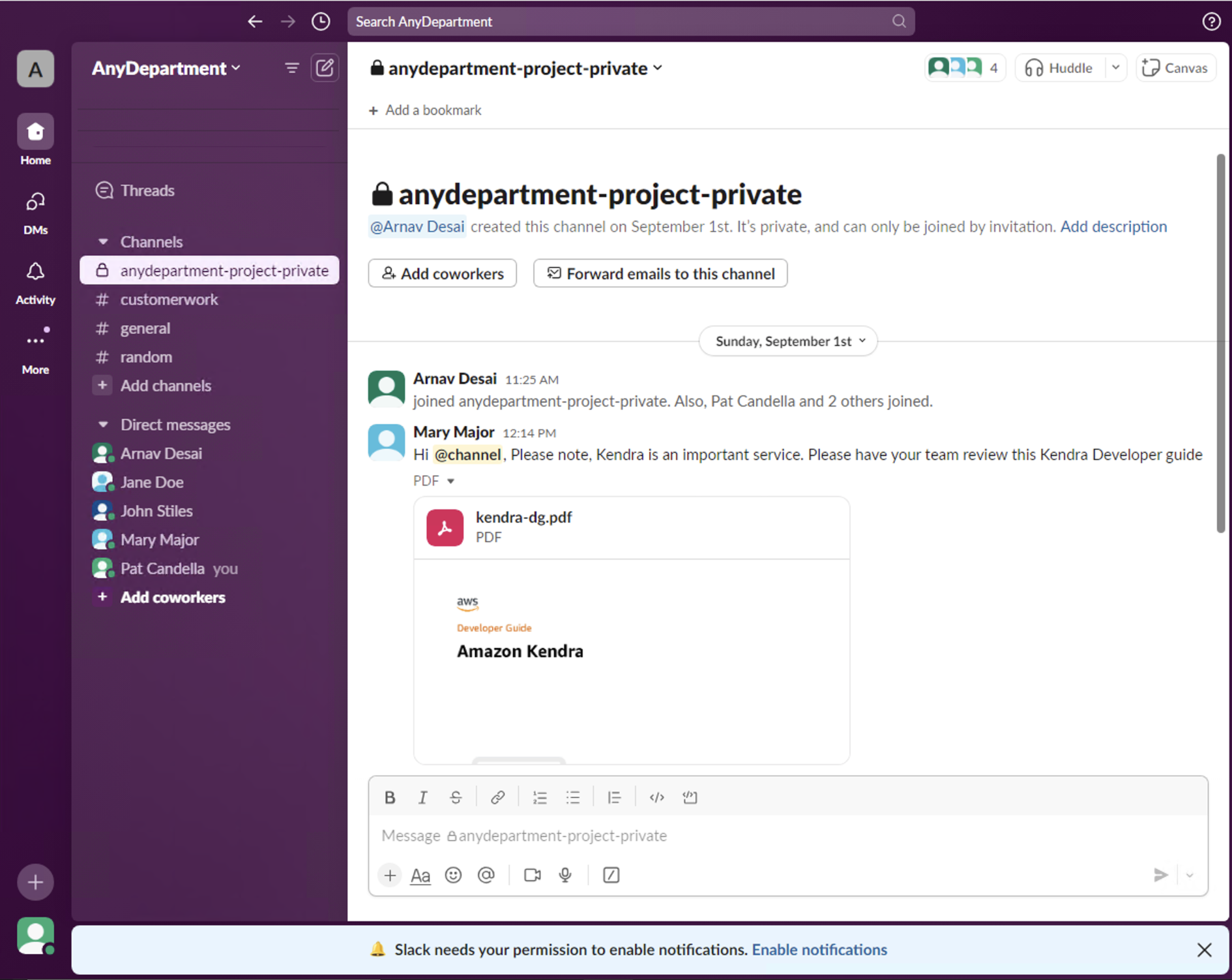 Next, you will create a private channel called #anydepartment-project-private with four out of the five users—arnav_desai, john_stiles, mary_major and pat_candella—and verify that the messages exchanged in a private channel are not available to non-members like jane_doe. Note that after you create a new private channel, you need to manually re-run the sync on the data source.