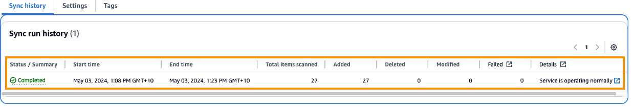 Additionally, as the sync process runs, you can monitor progress or debug failures by monitoring the Amazon CloudWatch logs that can be accessed from the Details section of the Sync run history.
