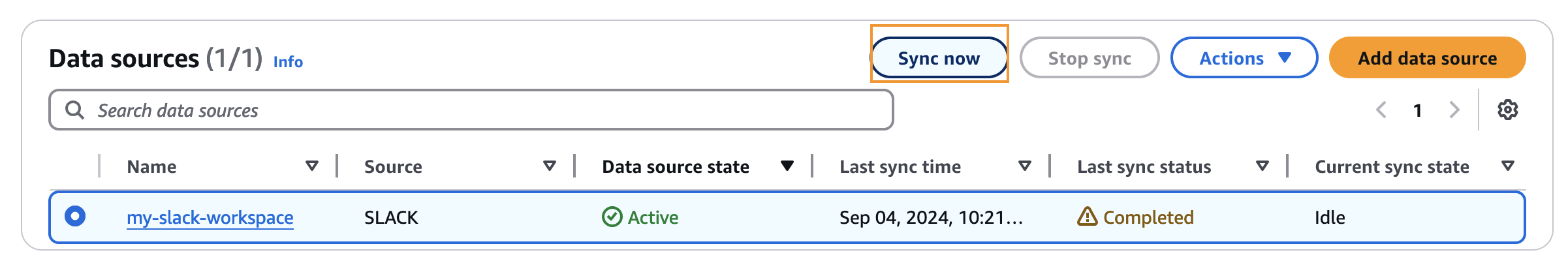 - After the application and the data source are created, select the data source and then choose Sync now to start syncing documents from your data source.