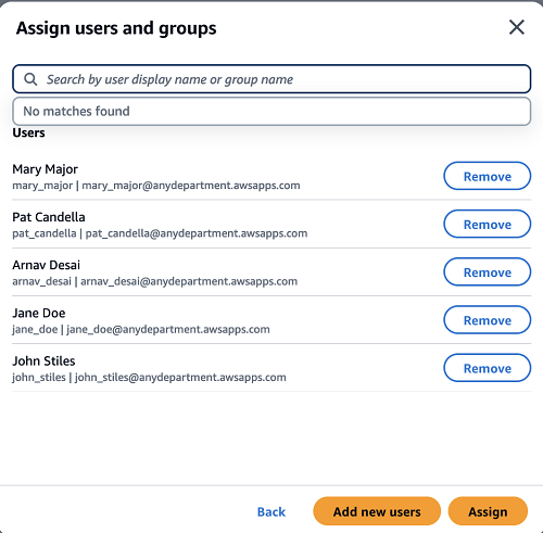 - Add the five users you created earlier, who are a part of IAM Identity Center and the Slack workspace to the Amazon Q Business application. To add users to Identity Center, follow the instructions in Add users to your Identity Center directory. When done, choose Add groups and users and choose Assign.