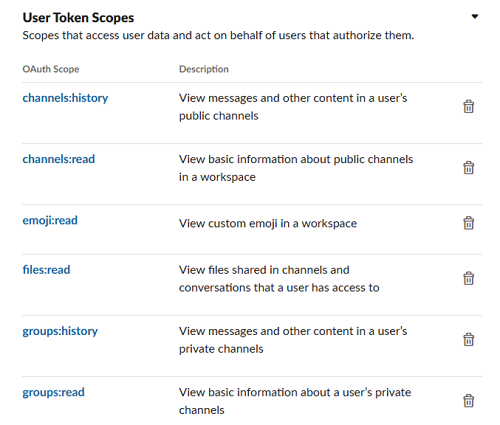 https://app.slack.com/client/T0123456789/...whereT0123456789is the team ID. - Add the OAuth scopes and read permissions.