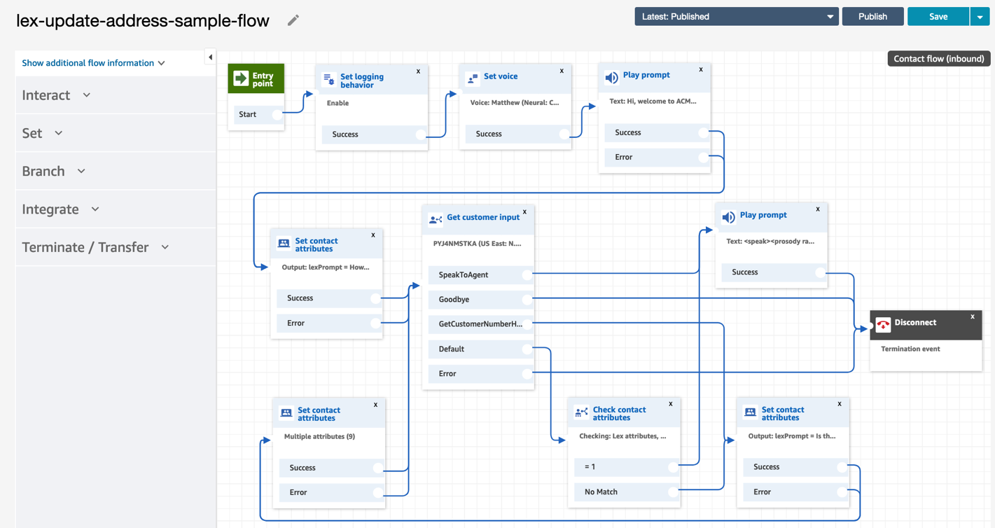 - Enter a Description, such as “Example flow to update an address with Amazon Lex”, and select the contact flow that you just created.