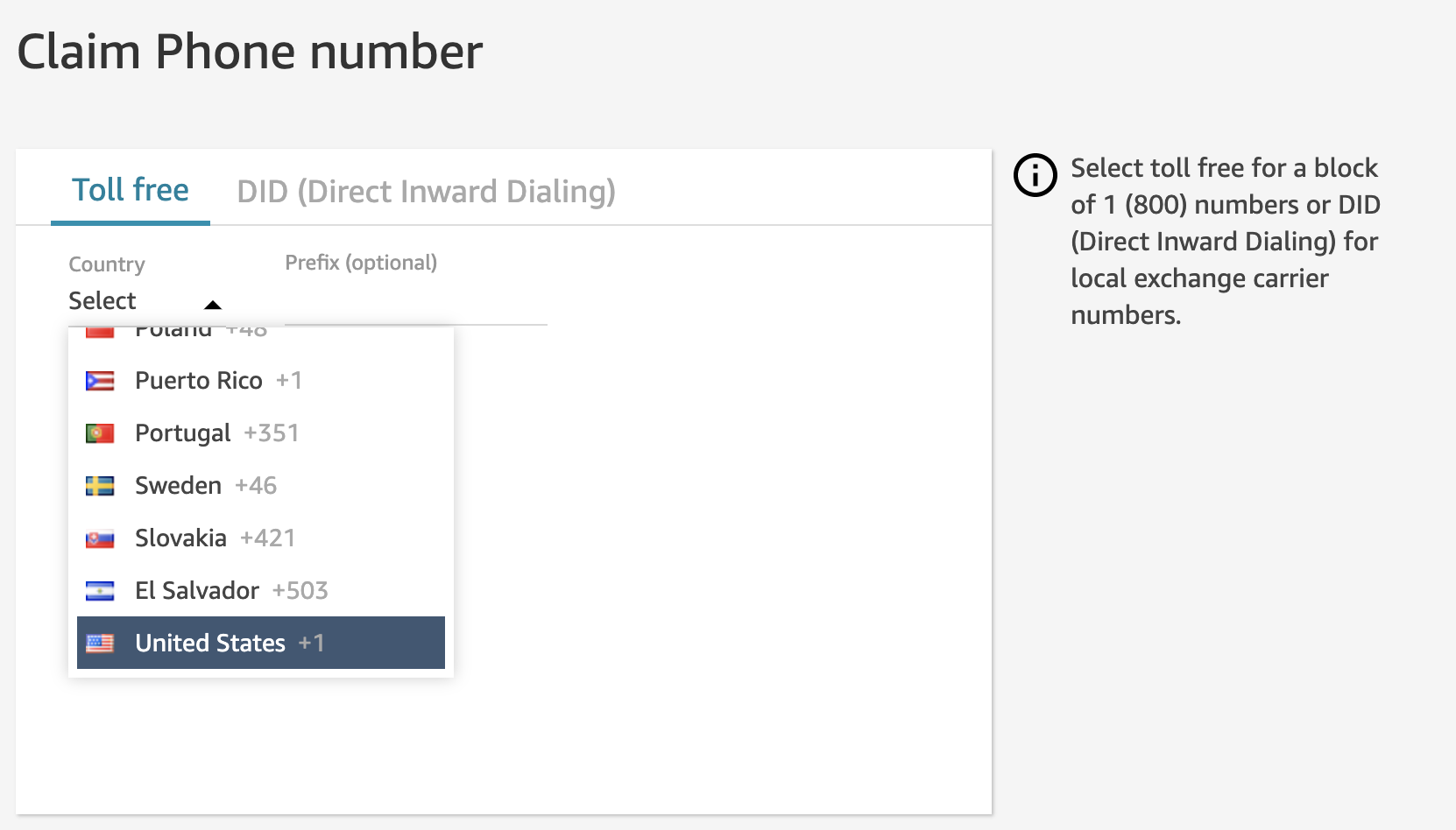 - Select Claim a number, choose a country from the Country drop-down, and choose a number.