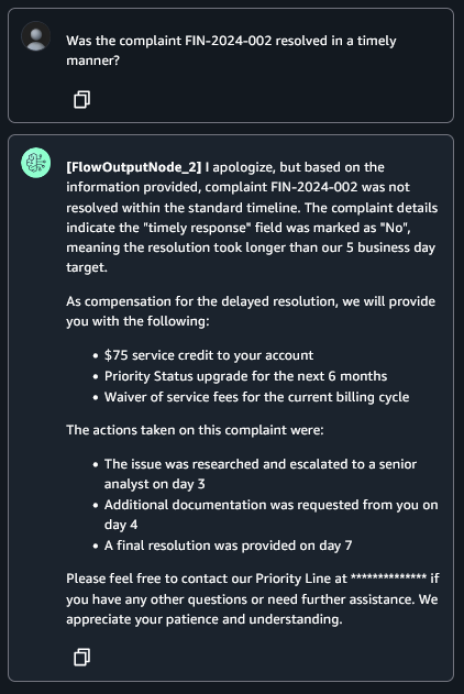 - Intelligent knowledge base – A comprehensive data source of resolved complaints that quickly retrieves relevant complaint details, resolution actions, and outcome summaries.