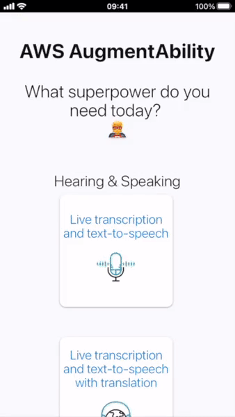 Animated screenshot showcasing the “Live transcription and text to speech” feature of AWS AugmentAbility.