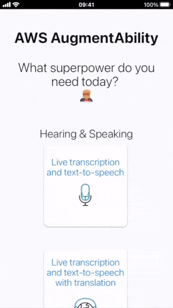 To get started with AugmentAbility, clone or fork the GitHub repository and start experimenting with the mobile web app. If you want to experiment with AugmentAbility before deploying resources in your AWS account, you can check out the live demo (credentials: demo-user, Demo-password-1).