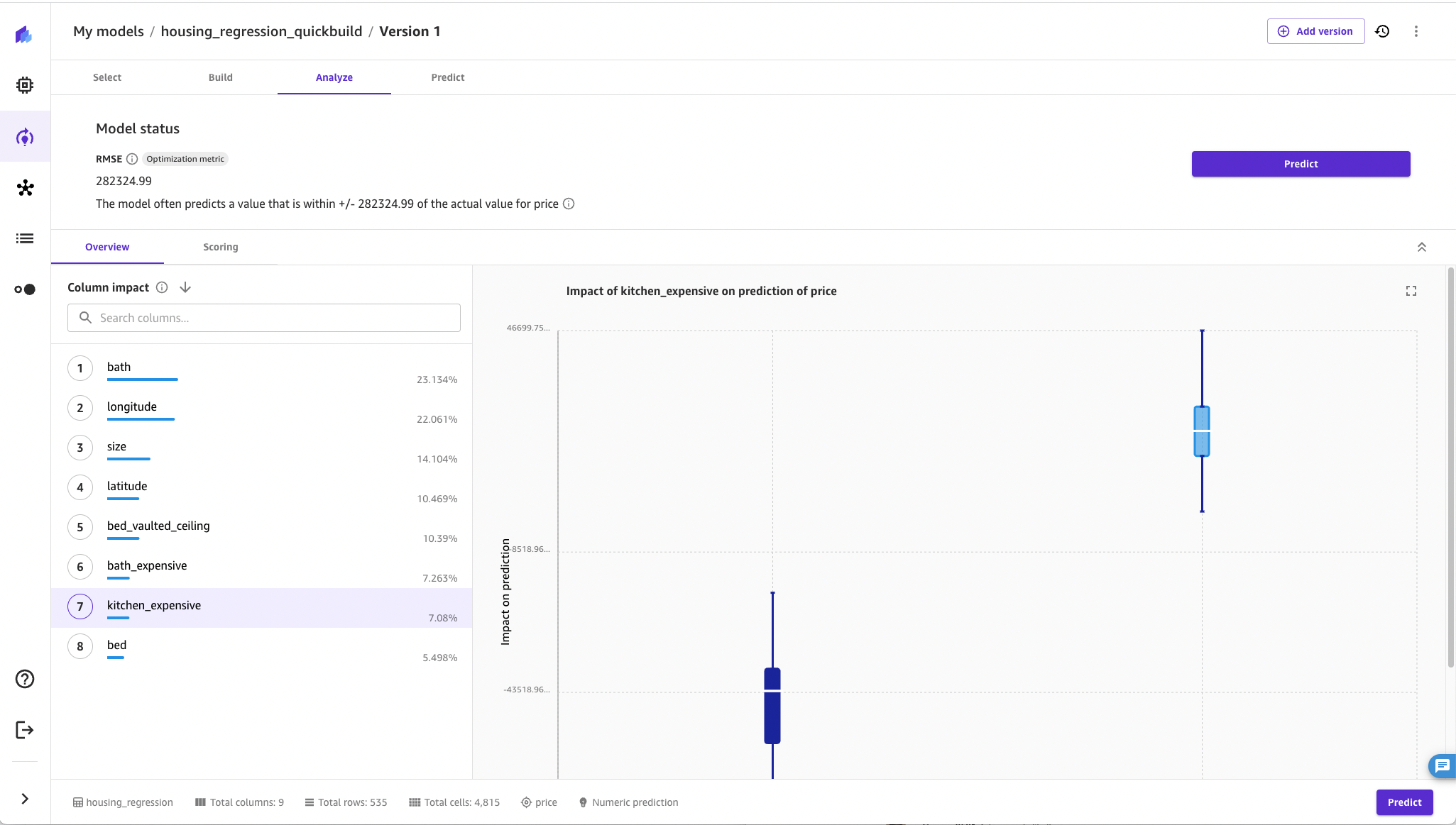 Finally, before moving to the next section, let’s explore if the features from the images were helpful. The following screenshot provides another SageMaker Canvas trained model without the features from the VQA model. We see the model error rate has increased, from an RMSE of 282K to an RMSE of 352K. From this, we can conclude that three simple questions from the images improved model accuracy by about 20%. Not shown, but to be complete, the R2 value for the following model deteriorated as well, dropping to a value of 62% from a value of 76% with the VQA features provided. This is an example of how SageMaker Canvas makes it straightforward to quickly experiment and use a data-driven approach that yields a model to serve your business need.
