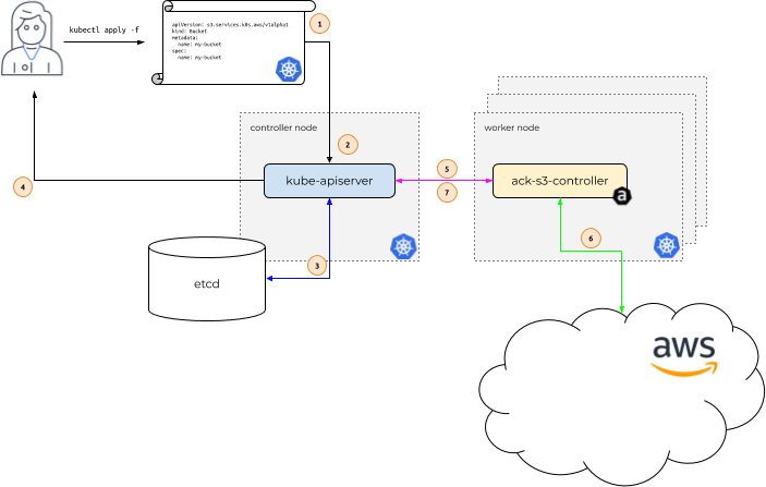 kubectl apply, passing in a file that describes a Kubernetes custom resource describing her S3 bucket.kubectl applypasses this file, called a manifest, to the Kubernetes API server running in the Kubernetes controller node. - The Kubernetes API server receives the manifest describing the S3 bucket and determines if Alice has permissions to create a custom resource of kind