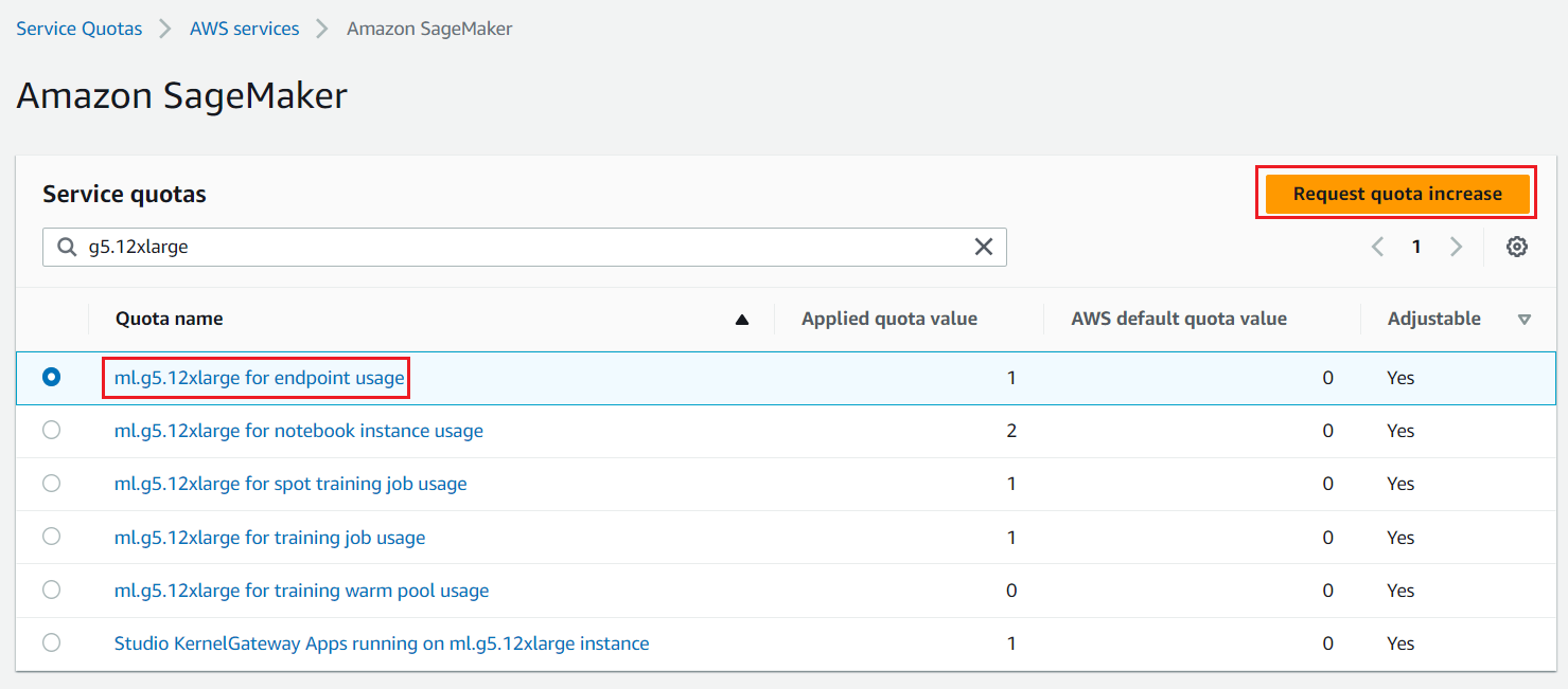 You need access to accelerated instances (GPUs) for hosting the LLMs. This solution uses one instance of ml.g5.12xlarge; you can check the availability of these instances in your AWS account and request these instances as needed via a Service Quotas increase request, as shown in the following screenshot.