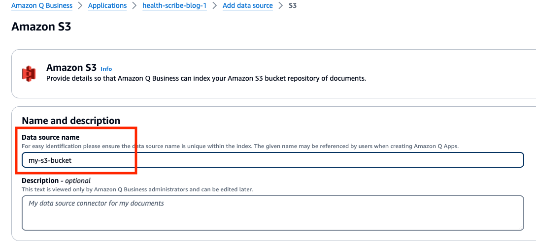 - To configure the S3 bucket with Amazon Q, enter a name for the data source. In our example we use