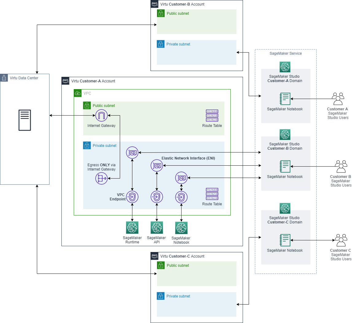 Let’s briefly review the core architecture of the solution. SageMaker instances are deployed in the private subnet of a VPC. The VPC uses three different Availability Zones. Egress traffic routes via NAT Gateway, which enables Virtu to limit API calls to predesignated IP addresses. Because the SageMaker instances are deployed in a private subnet, AWS PrivateLink is used. AWS PrivateLink enables connection directly to the SageMaker API or to the SageMaker Runtime through an interface endpoint in the VPC, instead of connecting over the internet. The VPC interface endpoint connects the VPC directly to the SageMaker API or Runtime without an internet gateway, NAT device, VPN connection, or AWS Direct Connect connection. The instances in the VPC don’t need public IP addresses to communicate with the SageMaker API or Runtime. The following is a schematic of the architectural solution.
