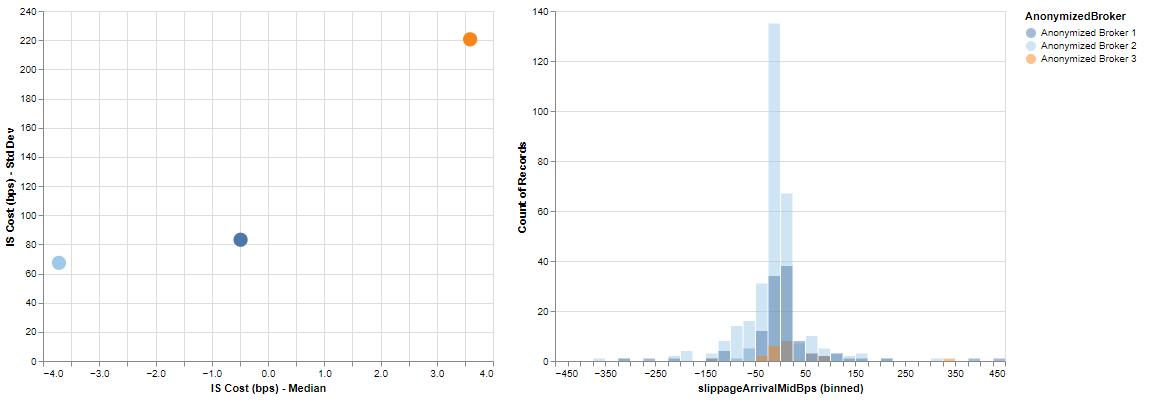 From the example below, the buy-side client opted to exclude any trade where the z-score was ±3. Comparing brokers across the initial IS (bps) metric, Anonymized Broker 2 had the most favorable performance (most positive number) but once outliers are excluded, Anonymized Broker 3 had the best performance. Anonymized Broker 2 had a few very positive outliers that skewed their overall performance up. Excluding a small amount of trading due to outliers changes which broker should receive more order flow.