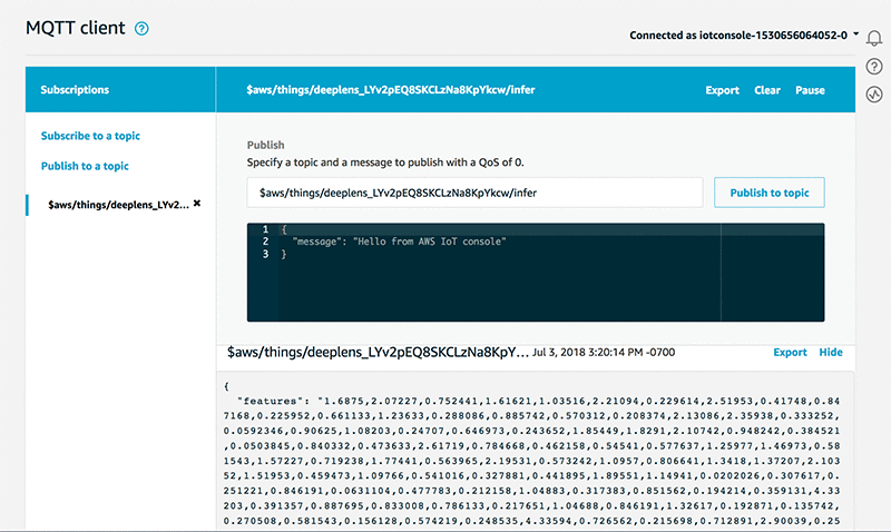 After the AWS DeepLens project is deployed to your DeepLens device, you should be able to confirm that the device is outputting feature vectors. It is a good idea to do this before moving on to deploy the other components of the project.