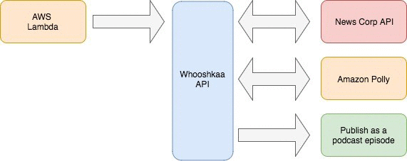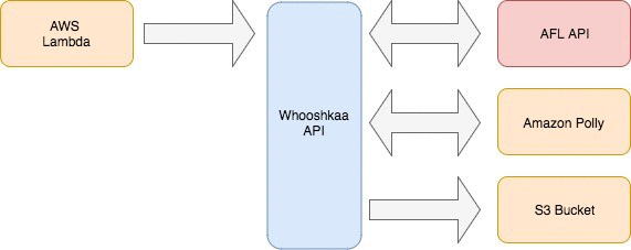 To trigger a crawl of AFL’s API that contained the data we needed, we set up a simple AWS Lambda function that would call our API. The Whooshkaa API would fetch the data, parse it, convert the text to speech, and publish the newly created RSS feed to Amazon S3.