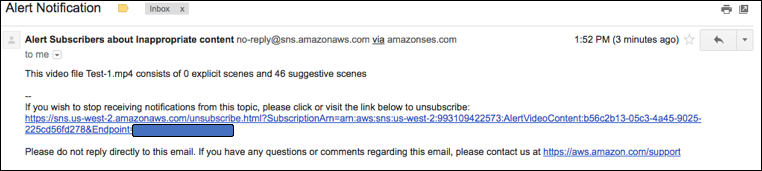 - View the Alert Notification sent to the email address mentioned in Step 2 (EmailAddr) with the total number of scenes highlighted with unwanted content.