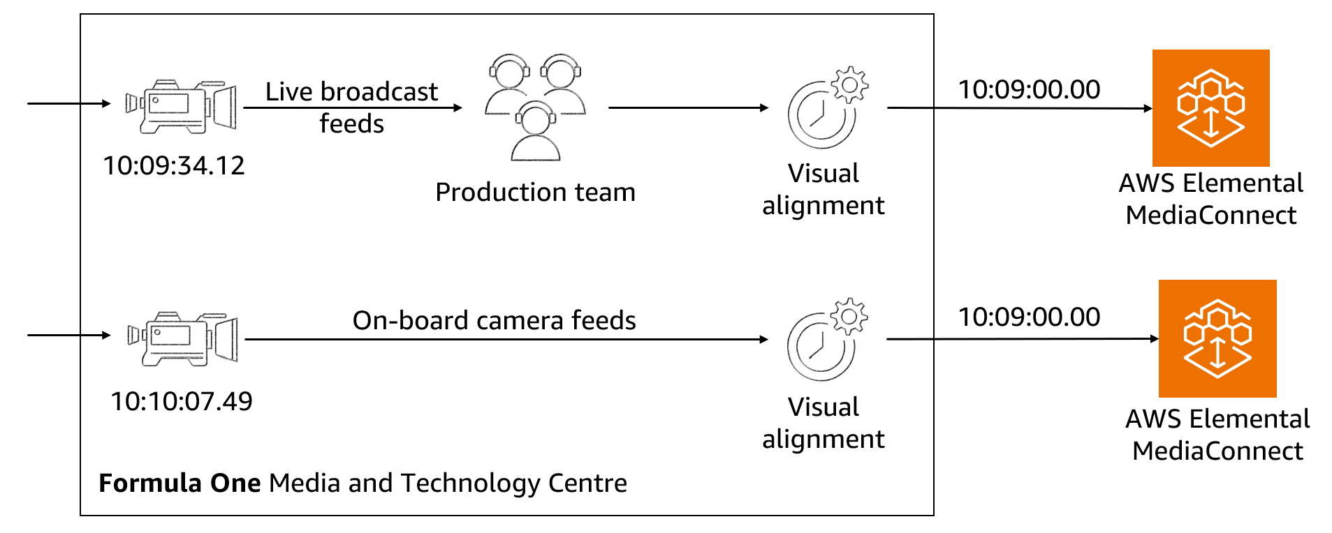 To accomplish this, F1 makes sure feeds are visually aligned at the same timecode when they leave the F1 Media and Technology Centre. This is needed because each feed can take a different path through the production signal chain. For example, F1 TV Live and International feeds both go through a production chain where equipment and processing introduce some additional delay. On the other hand, feeds such as the on-board cameras and data/driver tracker channels take a different signal chain, with different amounts of delay. This makes visual alignment critical to ensure that there is a consistent timecode aligned across all 24 video feeds.