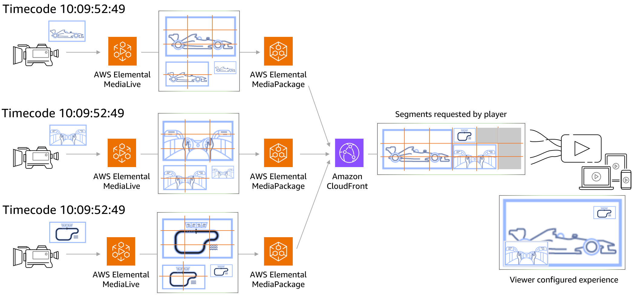 The final step in this workflow is to configure MediaLive to allow the F1 TV client to produce a multiview experience. This is done with a feature of High Efficiency Video Coding (HEVC) called tile encoding. With tile encoding enabled, MediaLive can generate a series of independent and extractable sections of a larger video resolution, which the decoder can use to decode any combination of tiles across any bitrate and resolution. This allows an F1 TV Premium user to configure any combination of videos, like driver battles, or a layout optimized for mobile viewing.