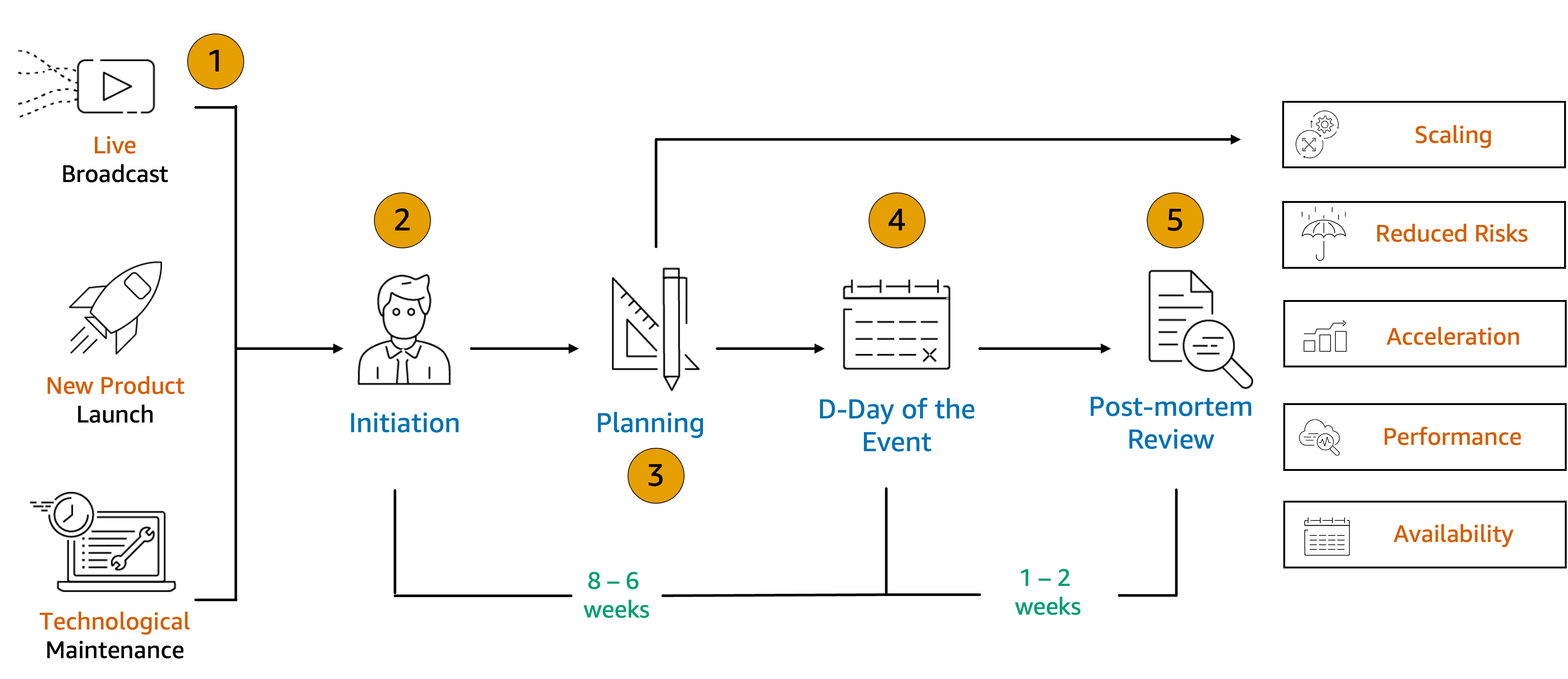 ![AWS Countdown Program's five steps: (1) Large-scale event definition (represented by the Live [Broadcast], New Product [Launch] and Technological [Maintenance]), (2) Initiation, (3) Planning, (4) D-Day of the Event (steps 2-4 have a timeline of 8-6 weeks noted), (5) Post-mortem Review (steps 4-5 have a timeline of 1-2 weeks noted). Timeline: 8-6 weeks preparation. Benefits listed: Scaling, Reduced Risks, Acceleration, Performance, Availability.](https://d2908q01vomqb2.cloudfront.net/fb644351560d8296fe6da332236b1f8d61b2828a/2025/10/27/AWS-countdown.png)