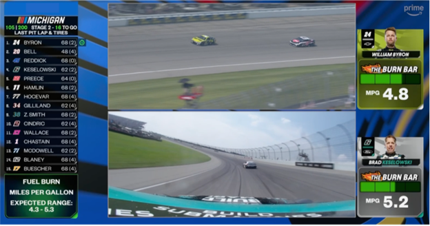 In May 2025, Amazon Prime Video introduced its newest AI-powered Prime Insight, Burn Bar, to their NASCAR on Prime coverage. The Burn Bar is a meter that predicts if a driver is driving hard or driving conservatively—typically achieved by drafting off other cars or getting a push from another car. The proprietary model continuously evaluates each driver’s fuel consumption and efficiency throughout the race. It provides meaningful insights as pivotal stages unfold.