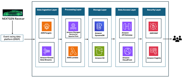 The solution’s core functionality centers on its data ingestion architecture. Live race data is captured through containerized NAT clients that run on Amazon ECS with AWS Fargate—a serverless, pay-per-use container compute service. This serverless approach provides automatic scaling capabilities that verify optimal performance and maintain high availability throughout race events. These specialized clients operate continuously during races, capturing and processing various streams of essential racing telemetry and information.