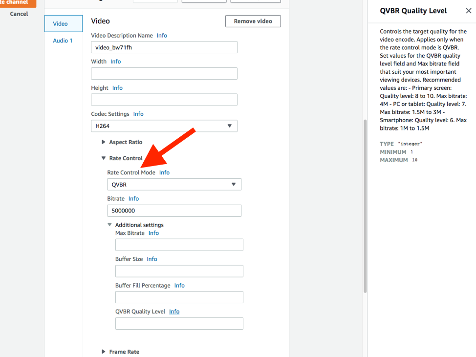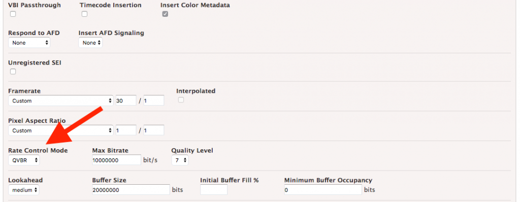 If you’re using AWS Elemental MediaLive, QVBR encoding mode is found in the Stream Settings area, under Rate Control: