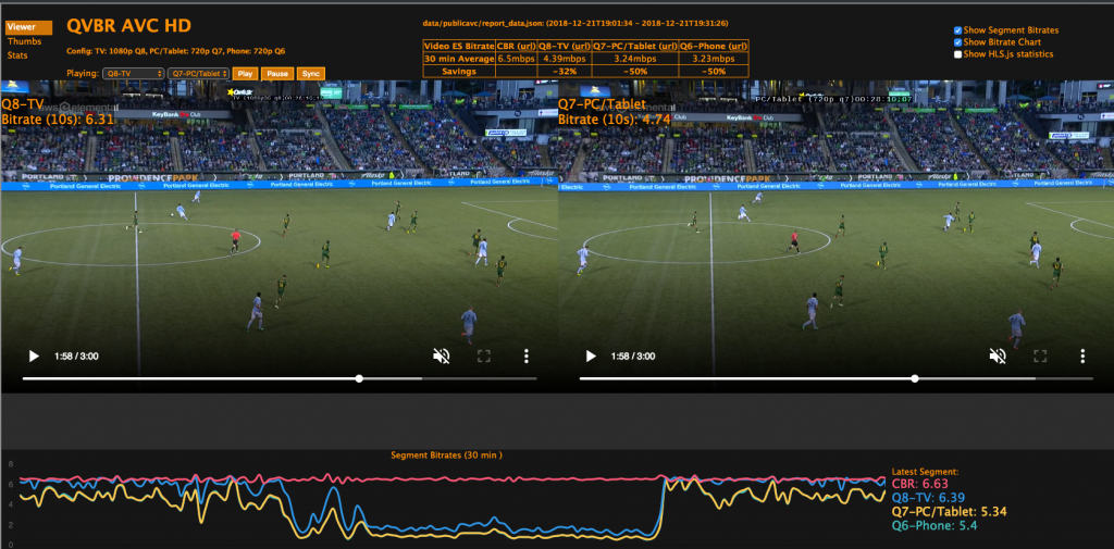 As you can see from the real-time graph running at the bottom, there is dramatic bit savings with QVBR compared to CBR mode for both the quality level 8 and 7 QVBR encodes. During a stretch of time in the middle of the match, the QVBR bitrates dropped significantly while the quality remained almost identical to the higher CBR bitrate, with the smaller file sizes resulting in direct cost savings on storage (for the archived version) and delivery (CDN data transfer).