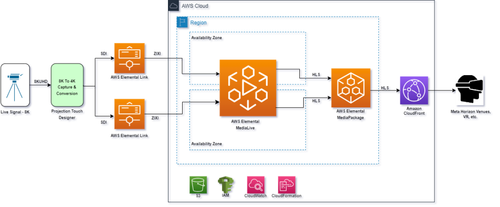 Felix & Paul Studios partnered up with Futuralis to build a live VR streaming experience to process and deliver 8K UHD-360o live video to a variety of end users and locations via the cloud. The team turned to AWS to implement the solution with AWS Media Services and Amazon CloudFront as core services for real-time video processing and content delivery, allowing viewers to experience an immersive event. In this post, we discuss the portion of the workflow responsible for 180° VR streaming to viewers using Meta Quest VR headsets via Meta’s Horizon Venues platform.