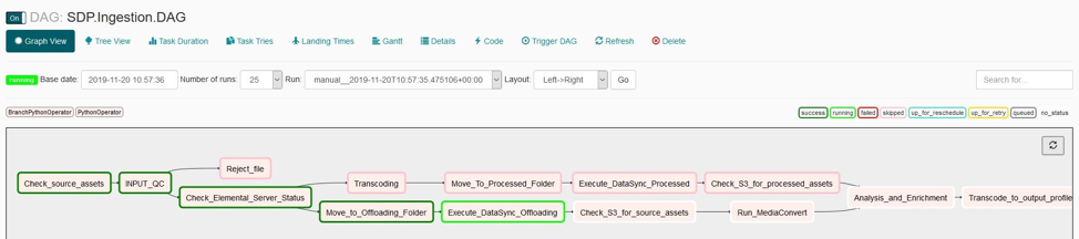 Fincons SDP embeds Apache Airflow as its de-facto engine for WMS. Apache Airflow is an open source framework that is well suited for authoring, scheduling, and monitoring distributed workflows. Apache Airflow is currently supported by a large and active community; many reference implementations are available. SDP handles the full end-to end workflow: content acquisition, initial quality control (QC), transfer to cloud, and video processing – transcoding to mezzanine formats – using a combination of AWS Elemental on-premises appliances and AWS Media Services in the cloud. Video is further analyzed using Amazon Rekognition and Amazon Transcribe services. External services like IMDb or others can also be used to enrich content. Typical interactive applications include celebrity and scene recognition, linking to related content, and preparation for interactive advertising.