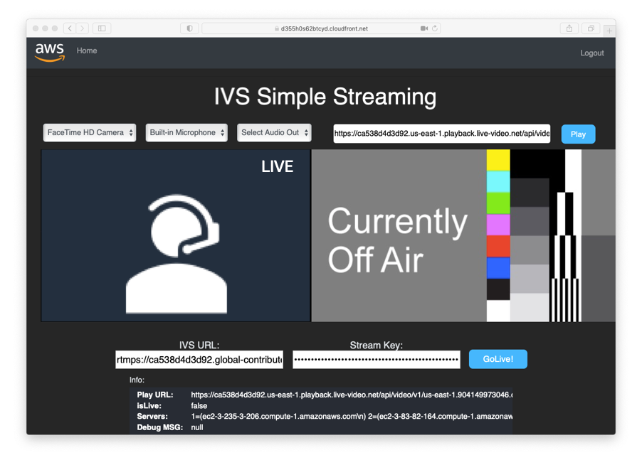 - Client player: This application uses Video.js player framework to decode the video streamed by Amazon IVS.
