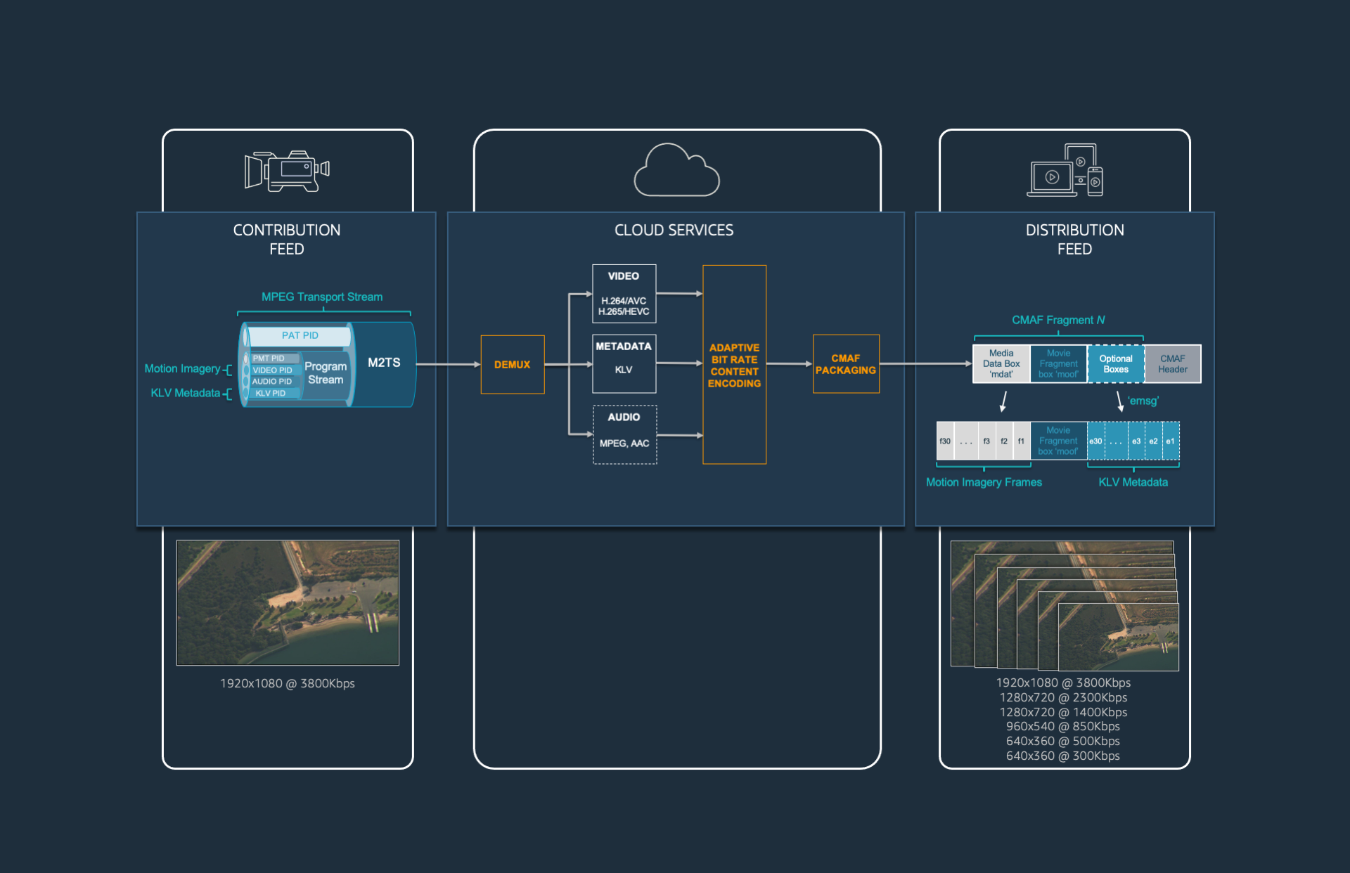 From media and entertainment (M&E) to defense, science, and agriculture, video is pervasive. Whether shot on a high-end camera in a studio or for a tactical mission from an unmanned aerial system (UAS), video and the environment in which it’s captured can provide invaluable information, such as sensor data, geolocation, instrument readings, or other forms of telemetry. Historically, military and intelligence organizations have leveraged Key-Length-Value (KLV), defined by the Society of Motion Picture and Television Engineers (SMPTE), to carry important information alongside high-definition video collected by UAS for intelligence, surveillance, and reconnaissance operations. While highly effective, previously this data was not being carried using the latest adaptive bitrate streaming (ABS) protocols, hindering organizations from capitalizing on the benefits of cloud-powered mission video systems.