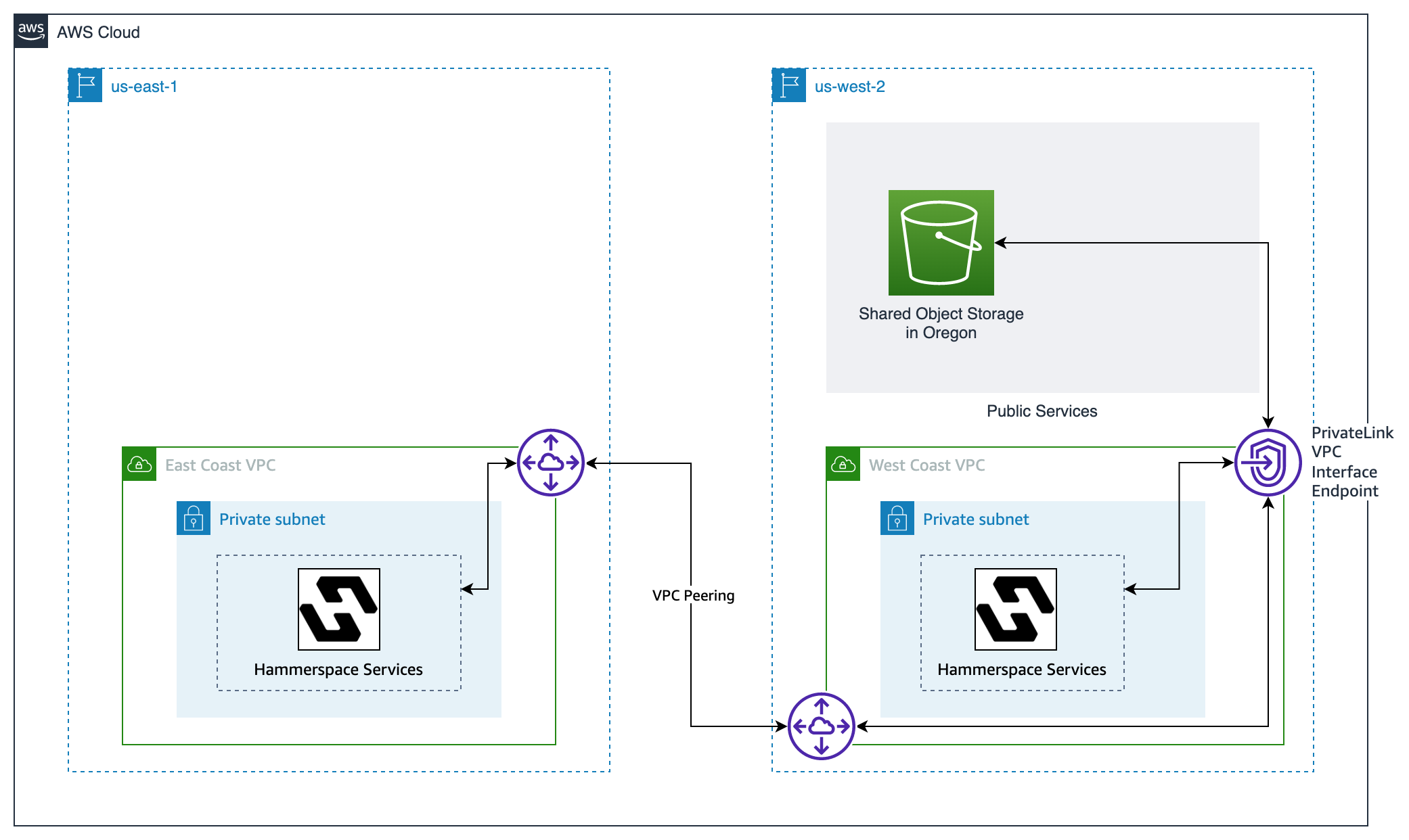 In its default configuration, Hammerspace uses public Amazon S3 endpoints to access S3 buckets used in its overall collaboration setup. This is not a secure nor performant configuration, as data will leave the AWS network and traverse the public internet when data is transferred from site to site.