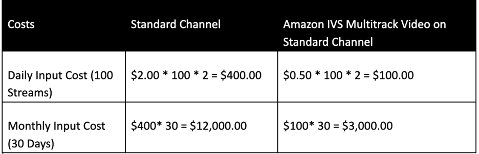 For example, currently with Amazon IVS Multitrack Video, viewers enjoy the best quality for their connection, and customers pay only $0.50 per hour, compared to $2.00 per hour for a standard channel without multitrack video. For an application hosting 100 live streams every day, each lasting two hours, Amazon IVS Multitrack Video reduces input costs by 75 percent. This is a saving of $9,000 each month (see Table 1), compared to a standard channel—all while maintaining high-quality streaming.