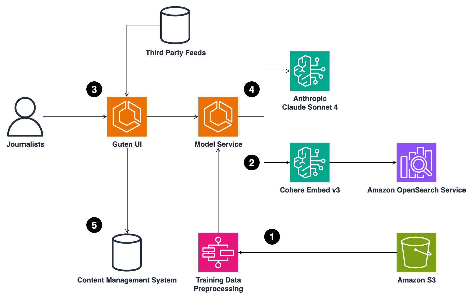 - Guten’s model service retrieves similar articles from the target publications by using the knowledge base and generates a draft using models (like Anthropic’s Claude Sonnet 4) on Amazon Bedrock.