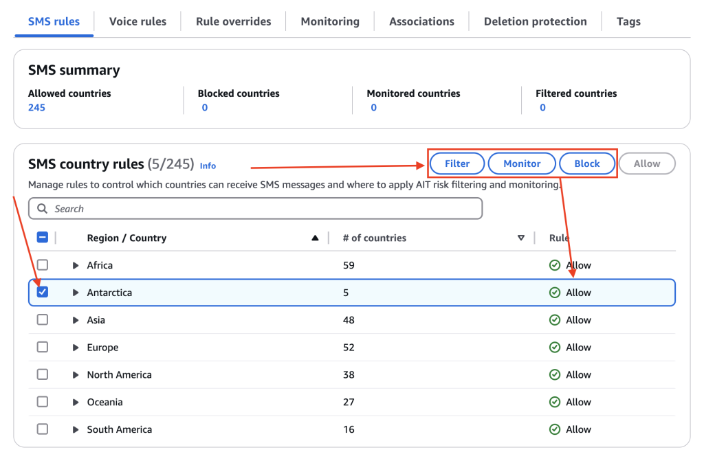 NOTE: You can only change your MMS country rules list through the AWS End User Messaging SMS and voice v2 API or AWS CLI. The Voice rules can be changed in the console but only after creating an SMS Protect Configuration. Once you have created your first Configuration you can edit it and select the “Voice Rules” tab.