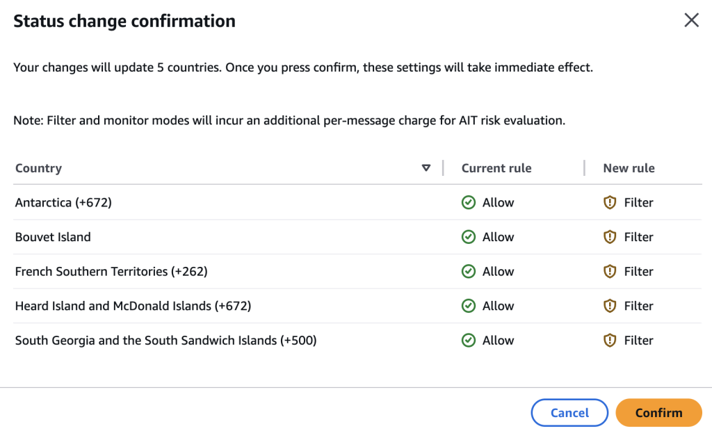 Filter mode provides automated defense against AIT by analyzing and proactively blocking AIT messages before they leave AWS, reducing your exposure to the financial and reputational impacts of SMS pumping. Turning on Filter at the Account level is the quickest way to protecting yourself. The tutorial below will walk you through configuration.