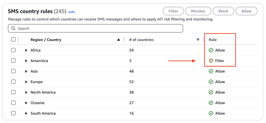 We launched AWS End User Messaging Protect to help our customers combat this growing threat. Initially launched with Country Level Blocking, we’ve now launched two new features, called Monitor and Filter, within AWS End User Messaging’s Protect capabilities. Updating your current security posture for SMS with Monitor and Filter, along with adhering to some other best practice security measures we will cover later, will make it harder for bad actors to target and inflate your SMS costs with bots or other measures.