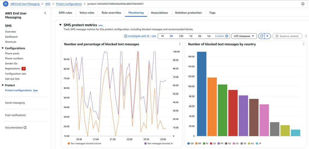 Take a proactive, multilayered approach to combating the growing threat of SMS fraud by leveraging the new Filter and Monitor capabilities within AWS End User Messaging Protect. These features empower you to gain visibility into potentially malicious traffic, automate the blocking of suspected AIT, and protect your messaging infrastructure while preserving the seamless experience your customers expect.