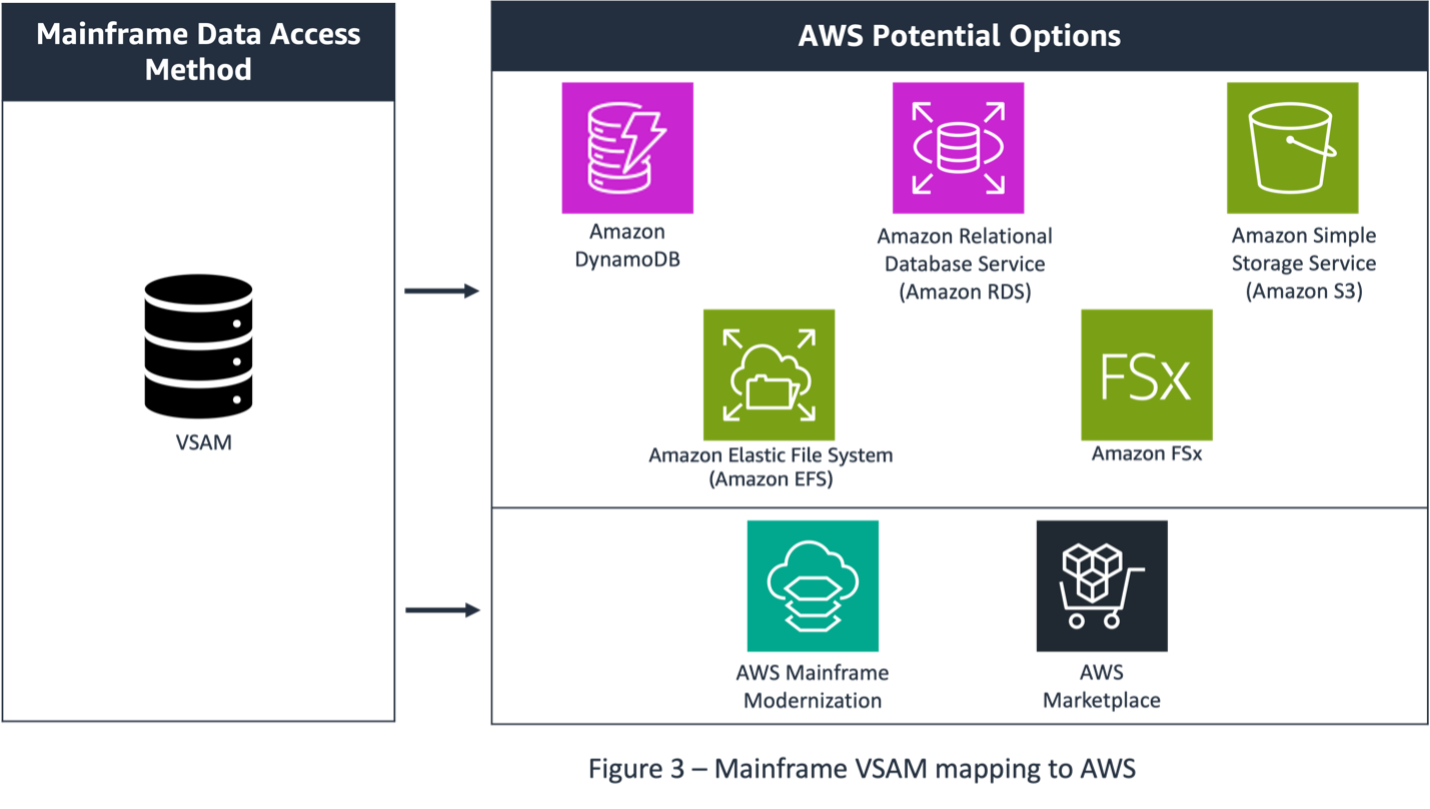 The VSAM datasets are divided into three types based on the data storage and access methods: entry-sequenced data set (ESDS), key-sequenced data set (KSDS), relative record data set (RRDS). For batch processes, customers can migrate data from ESDS to Amazon S3, Amazon Elastic File System (Amazon EFS), or Amazon FSx for Lustre , which allow sequential access to records, like the access pattern of ESDS. For other cases, Amazon RDS is a migration option. Figure 3 shows the potential options to migrate VSAM to AWS Cloud.