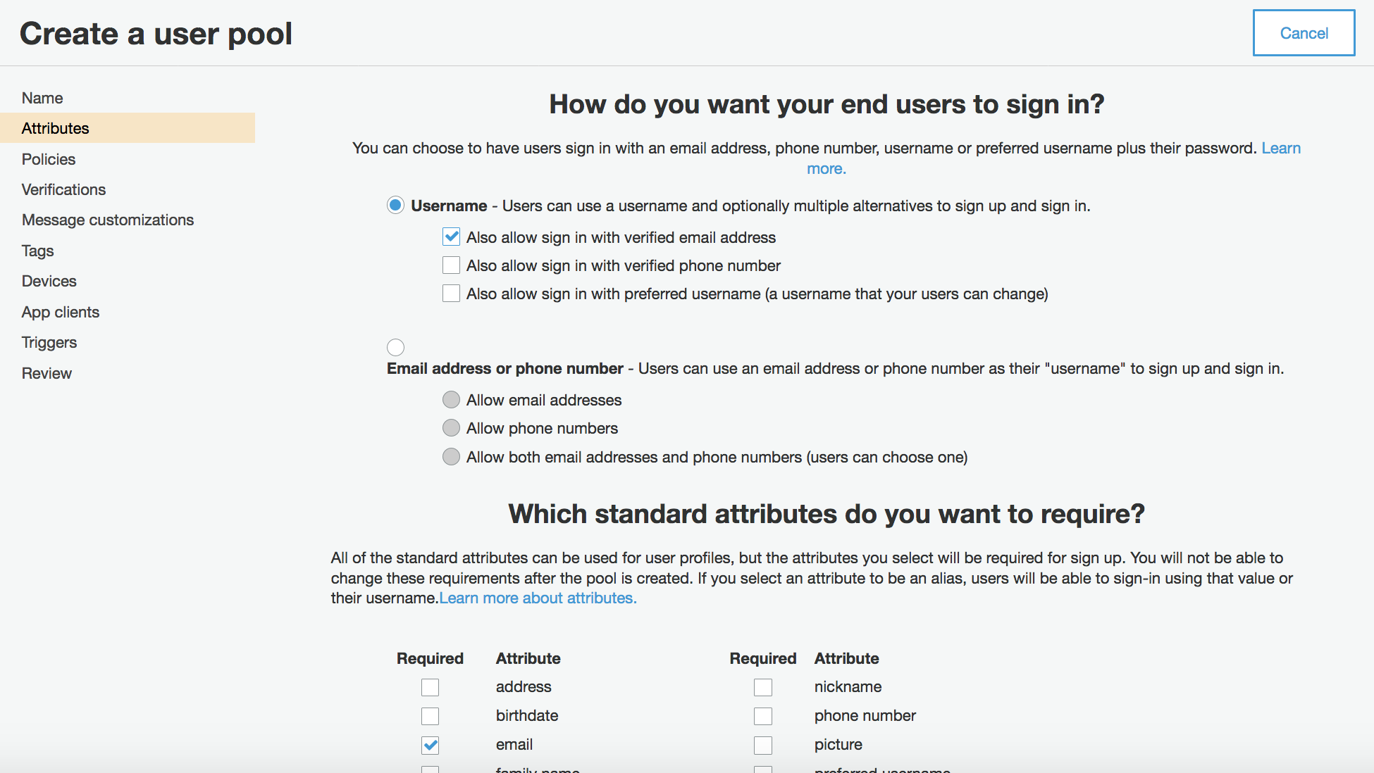 - Choose Username and then choose Also allow sign in with verified email address. In addition, check email as a Required attribute.